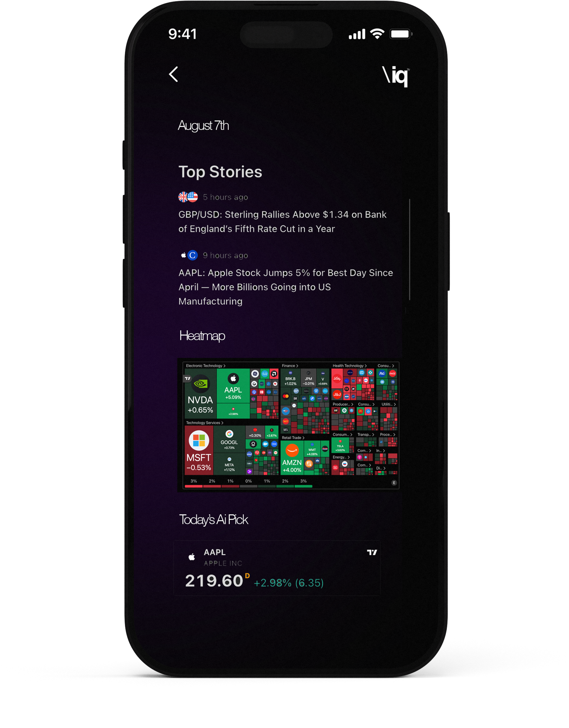 \iq puts the entire market pulse in the palm of your hand; live news, dynamic heat maps, and AI-selected opportunities. One platform. All signals. Zero distractions.